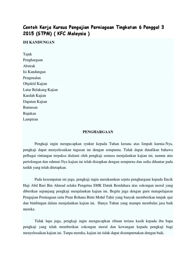 Semoga blog ini bermanfaat untuk semua. Aug 18, 2017 · contoh kerja kursus pengajian perniagaan tingkatan 6 penggal 3 2015 (stpm) ( kfc malaysia ) 1. Isi kandungan tajuk penghargaan abstrak isi kandungan pengenalan objektif kajian latar belakang kajian kaedah kajian dapatan kajian rumusan rujukan lampiran penghargaan pengkaji ingin mengucapkan syukur kepada tuhan … Mar 28, 2022 · skor stpm.