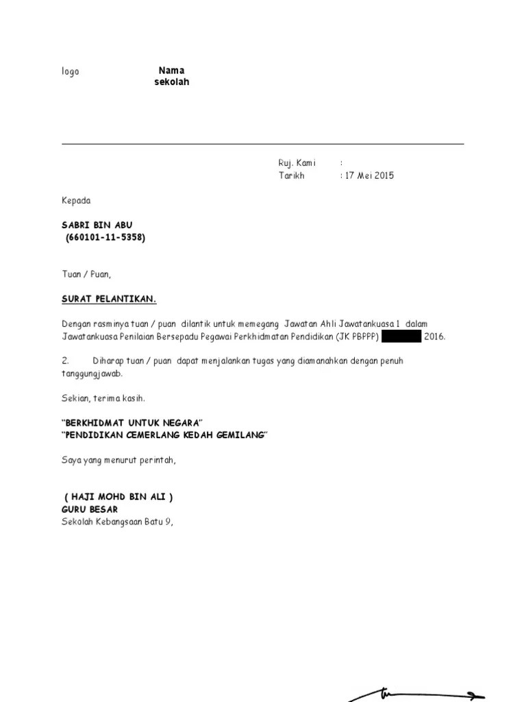 Surat lantikan guru ke jawatan khas. Pengerusi abdul mu'in bin abdul kassim. Memastikan pp telah memberikan borang markah kepada jawatankuasa pbppp untuk. 361370589 surat lantikan skpmg2 docx. Jawatankuasa penilaian bersepadu pegawai perkhidmatan pendidikan pejabat. Penilaian bersepadu pegawai perkhidmatan pendidikan pbppp. Surat perlantikan ahli jawatankuasa skpmg2. Sukacita dimaklumkan bahawa tuan/ puan telah dilantik sebagai ahli jawatankuasa penilaian bersepadu pegawai .